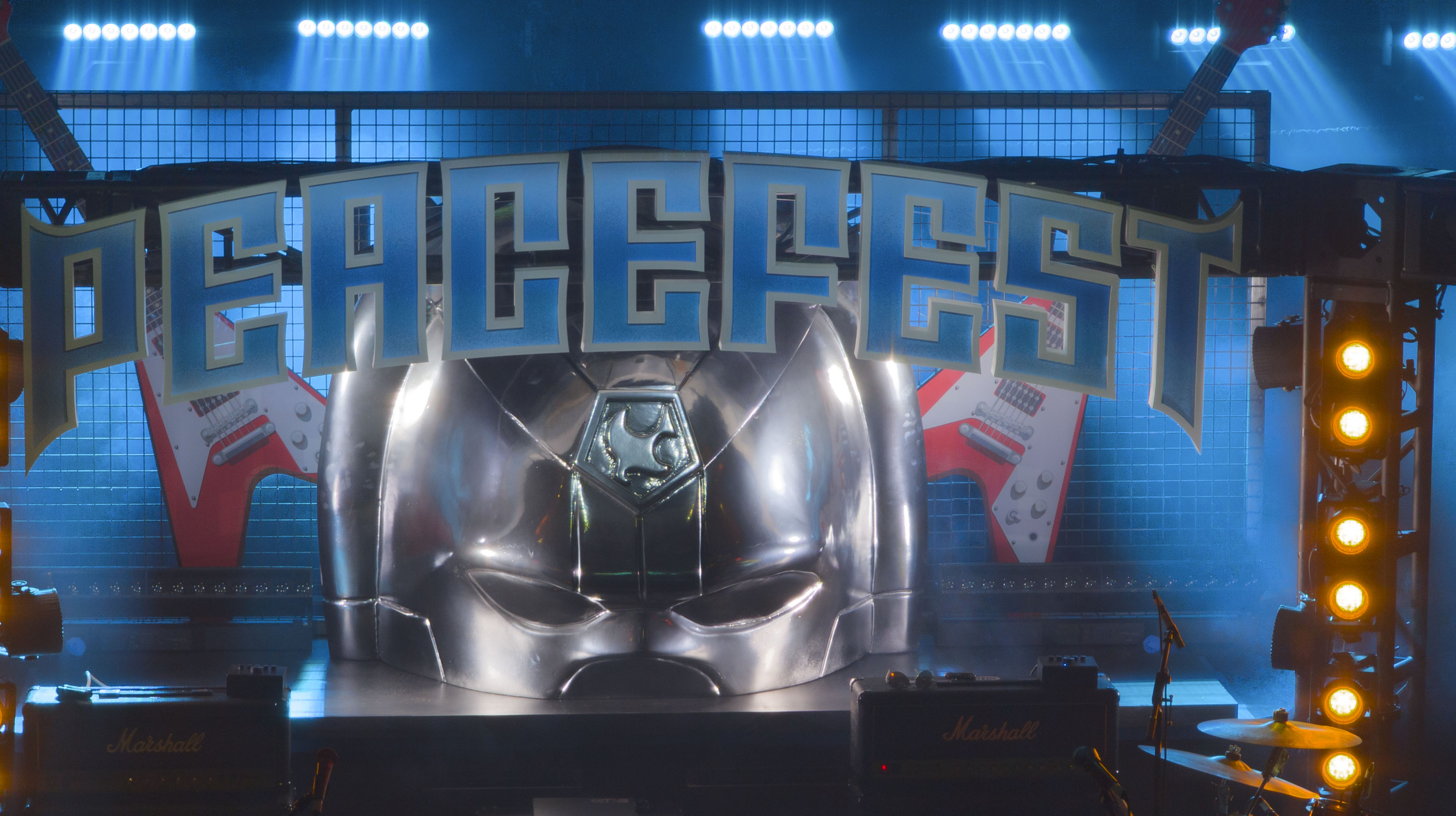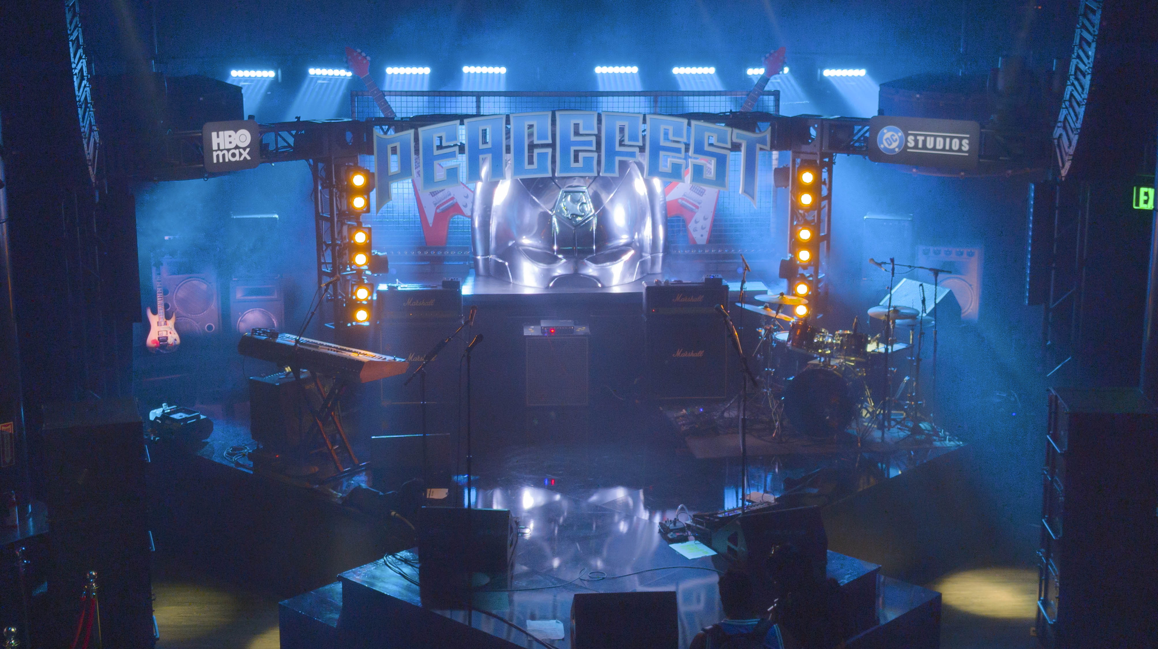 Walking in the doors for Peacefest, we were funneled down a portal tunnel into a pocket dimension where the whole event was to take place. The in-universe explanation of how this was going down and how Peacemaker made his way into the real world. Yes, this is a multiverse situation, and those who have seen trailers for the new season would be up on all of that already. From here, we were handed our swag of a Peacemaker helmet and a bandana to help celebrate Peacefest, then we were let loose into the building to see what was brought over for us to celebrate and see from the show. The first wave of things we had before the massive concert that was about to go down with the Hair Metal that the character is so in love with.
