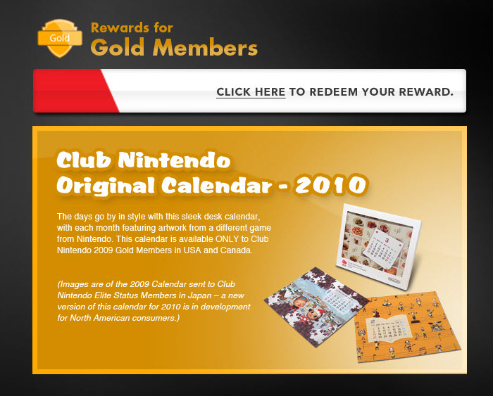 The Gold status level reward is not what I would classify as the greatest reward but considering the difference between Gold and Platinum is a minimum purchase of 5 Wii titles. The reward is a Club Nintendo 2010 calendar.