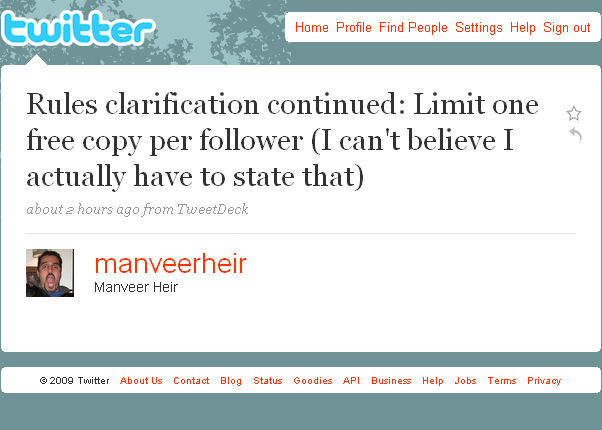 Around 12:44 PM Aug 12th - Rules clarification continued: Limit one free copy per follower (I can't believe I actually have to state that) |