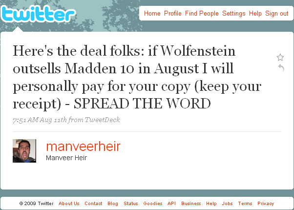 7:51 AM Aug 11th - Here's the deal folks: if Wolfenstein outsells Madden 10 in August I will personally pay for your copy (keep your receipt) - SPREAD THE WORD |