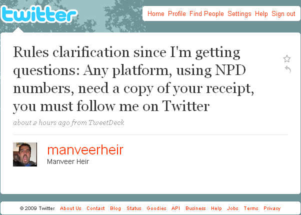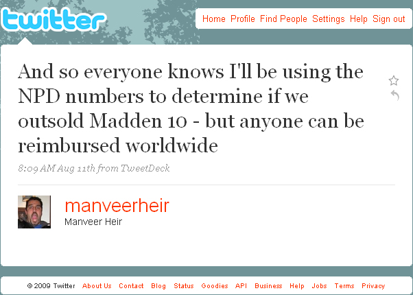 8:09 AM Aug 11th - And so everyone knows I'll be using the NPD numbers to determine if we outsold Madden 10 - but anyone can be reimbursed worldwide |